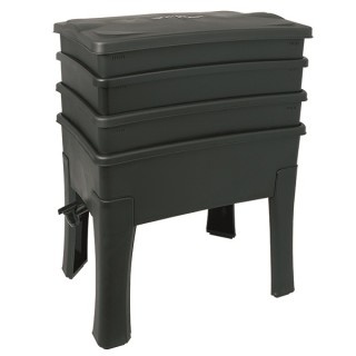 Ventilated collector tray, with worm mound, tap and sump; Stylised legs with ant prevention; Instructions engraved on underside of lid; Australian designed & made; Made from 100% recycled plastic; Assembled size 57cm long x 39cm x 75cm; Capacity: 77 Litres